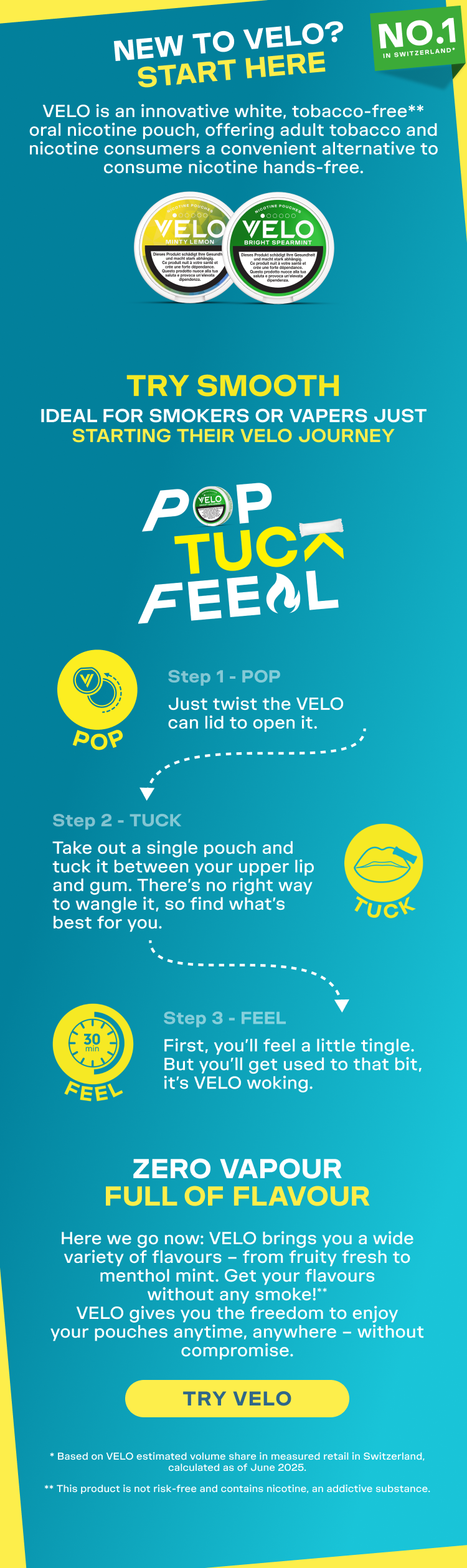 VELO sind innovative, weisse, tabakfreie** orale Nicotine Pouches, die erwachsenen Tabak- und Nikotinkonsumenten eine praktische Alternative bieten, Nikotin freihändig zu konsumieren.