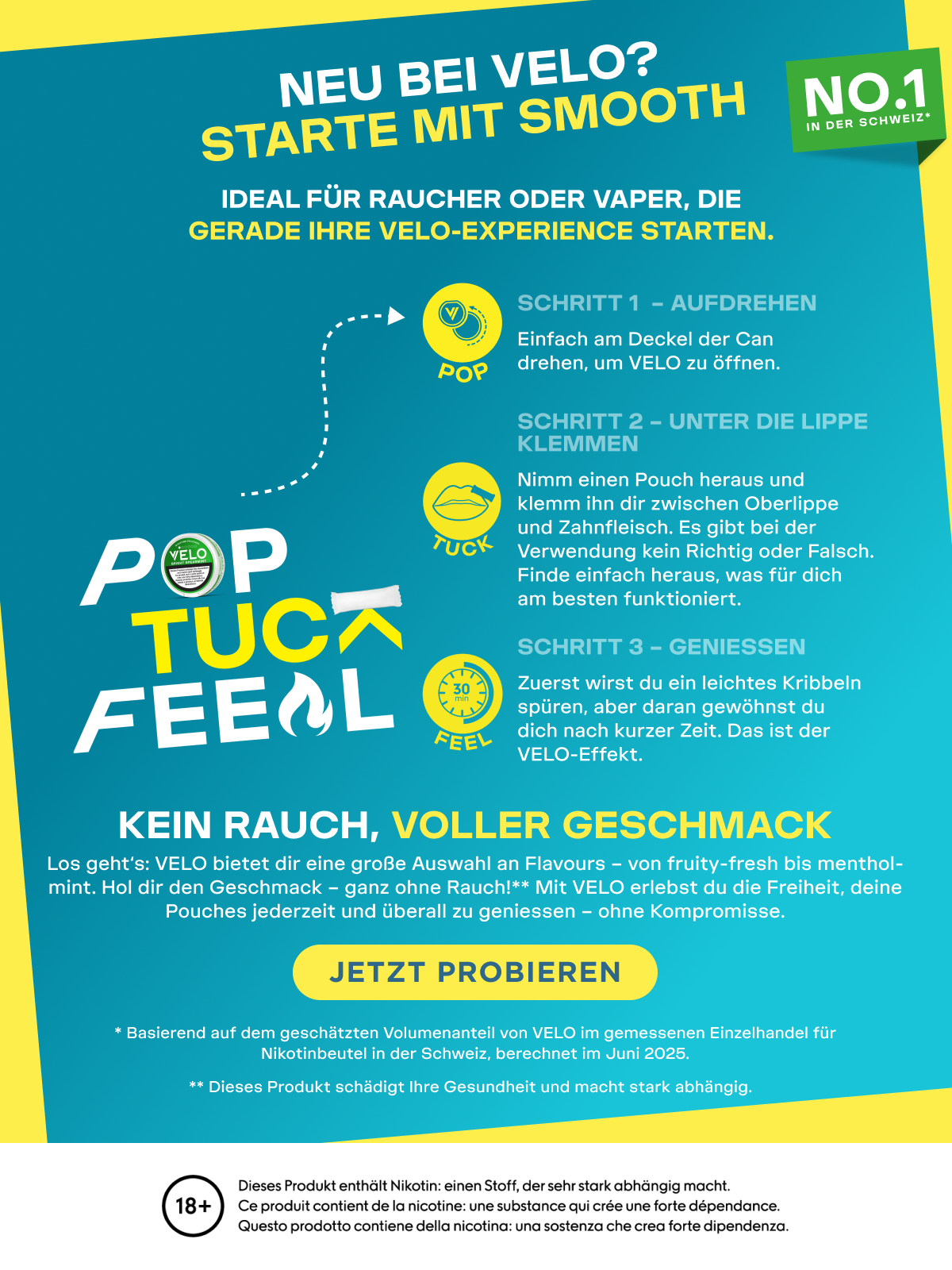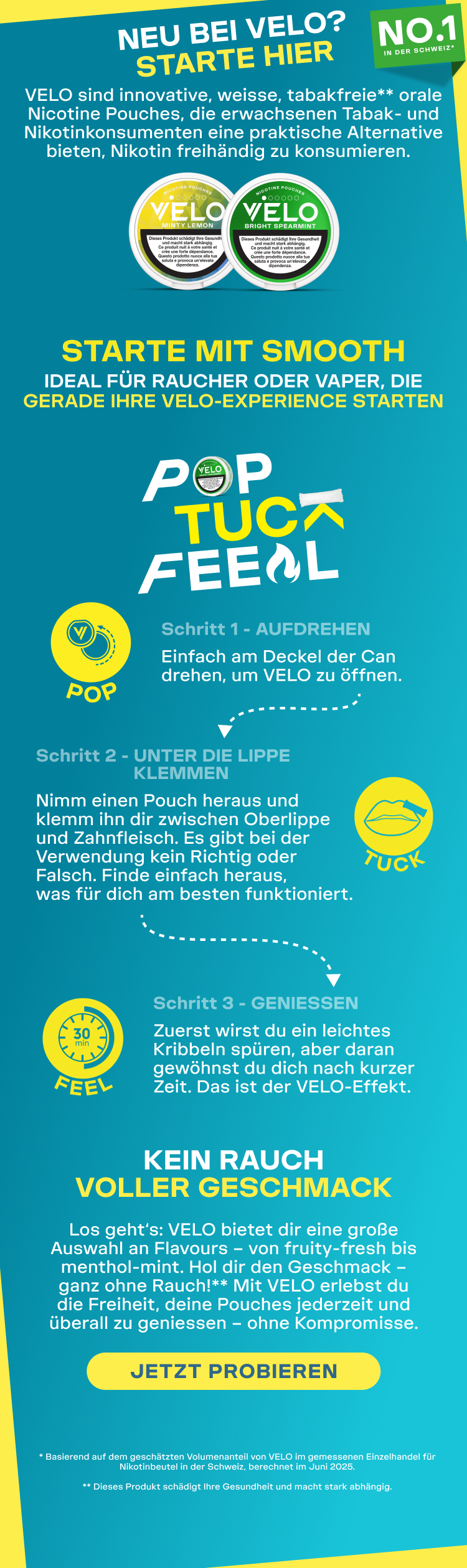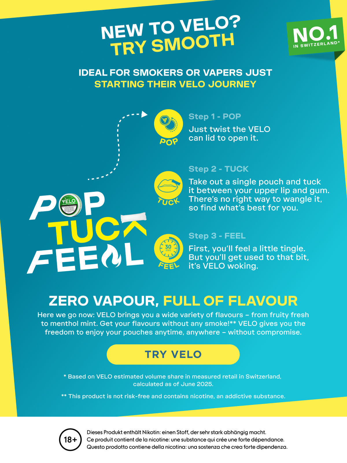* Basierend auf dem geschätzten Volumenanteil von VELO im gemessenen Einzelhandel für Nikotinbeutel in der Schweiz, berechnet im Juni 2025.