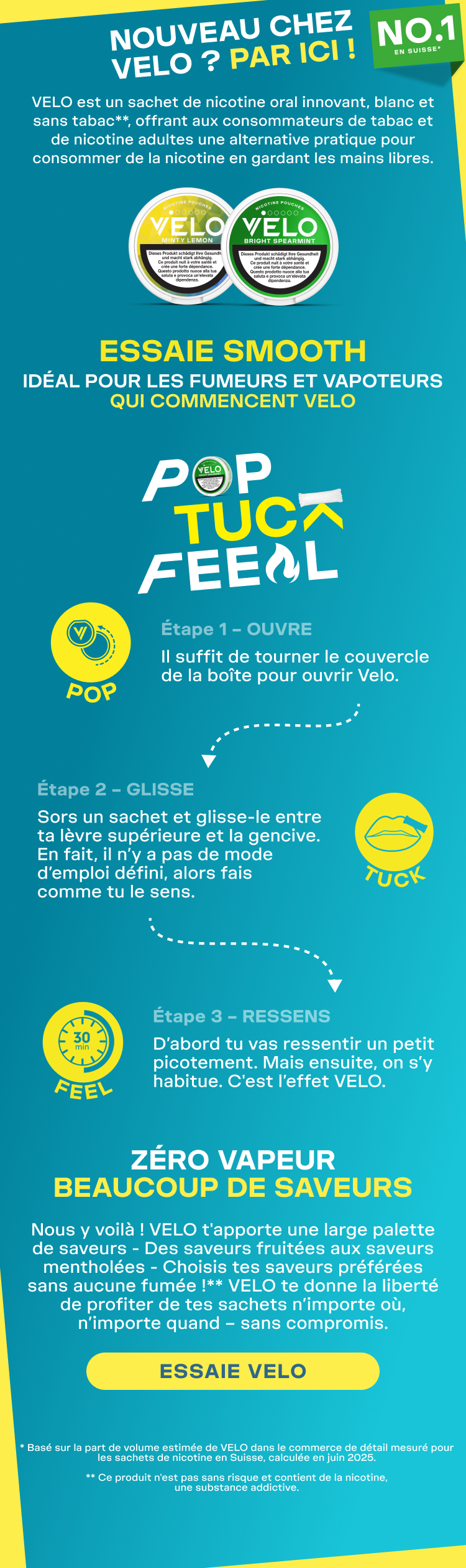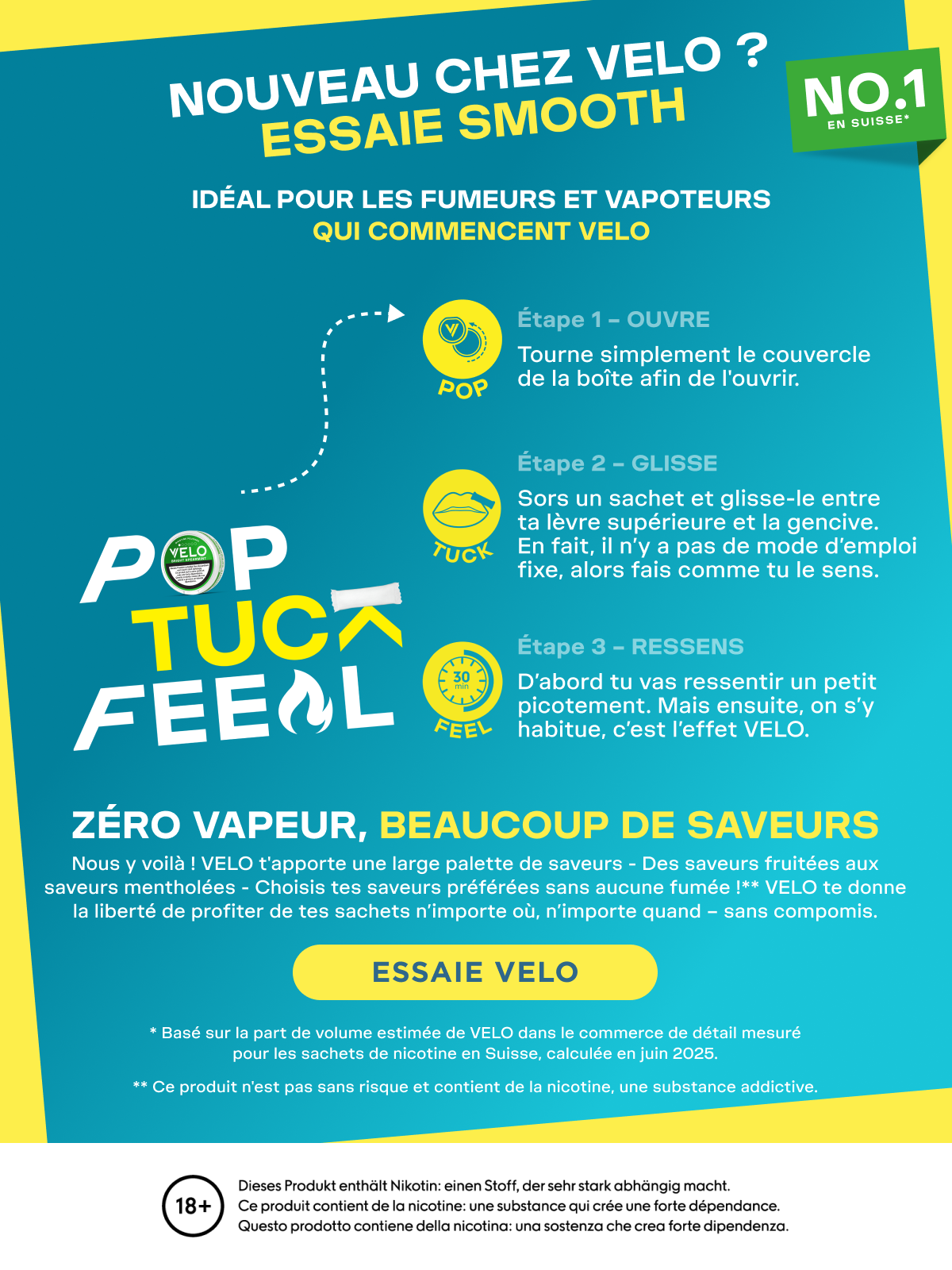 * Basé sur la part de volume estimée de VELO dans le commerce de détail mesuré pour les sachets de nicotine en Suisse, calculée en juin 2025.