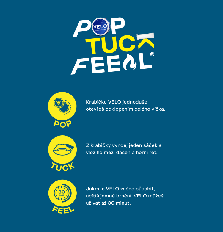 Nikotinové sáčky VELO představují moderní způsob užívání nikotinu. Neobsahují žádný tabák, méně barví zuby* a jsou bez zápachu a kouře**. VELO můžeš užívat kdekoliv a kdykoliv: v MHD, kanceláři i v letadle. Na výběr máš z mnoha různých příchutí v různých intenzitách. Stačí si jen vybrat tu svou.
